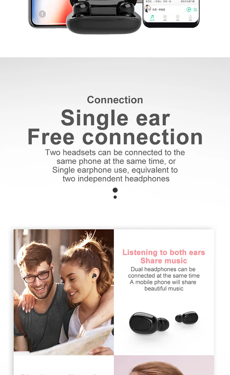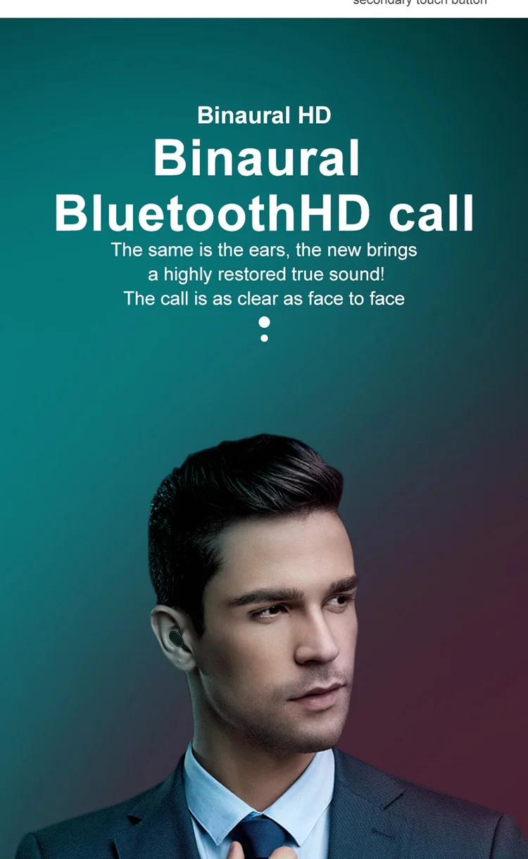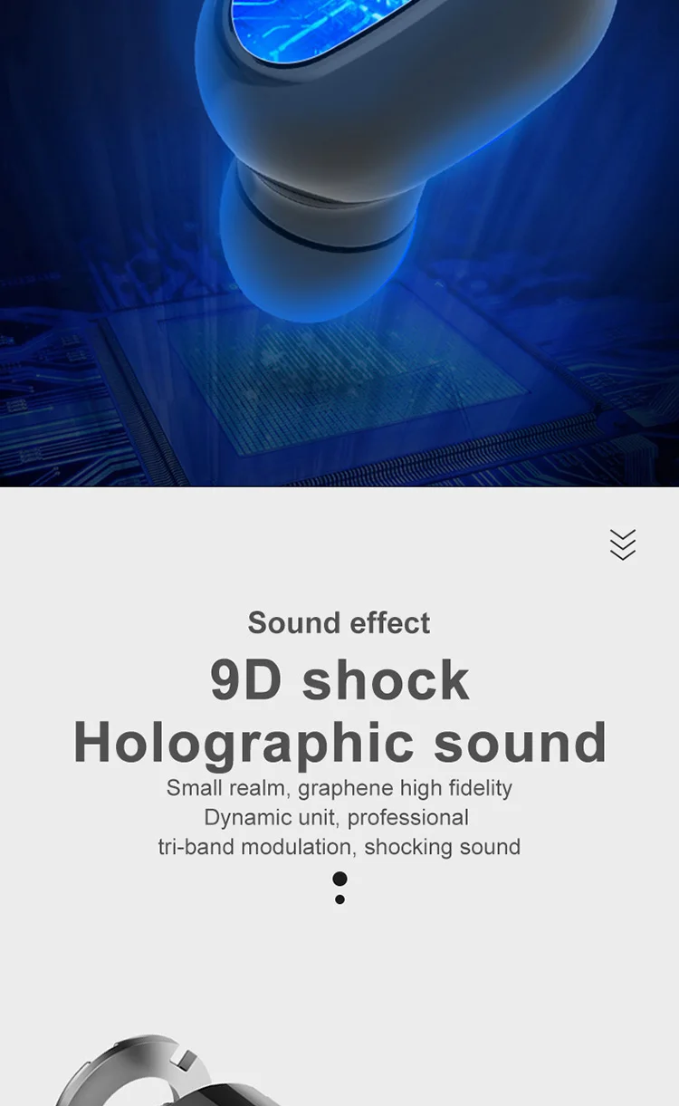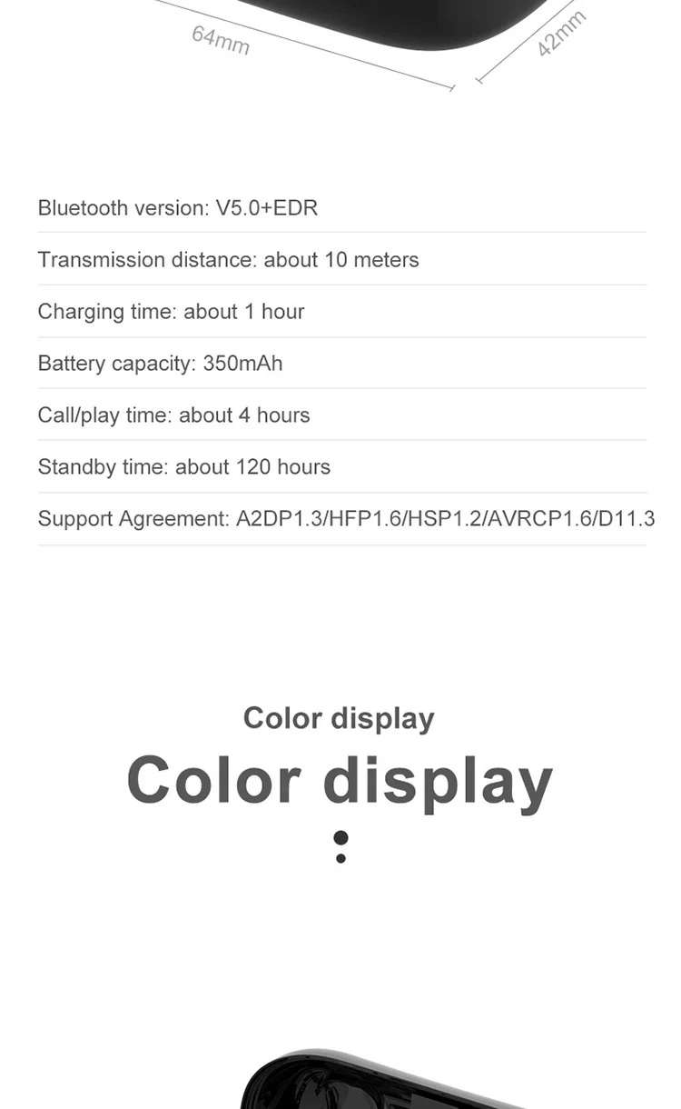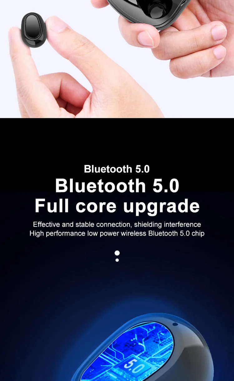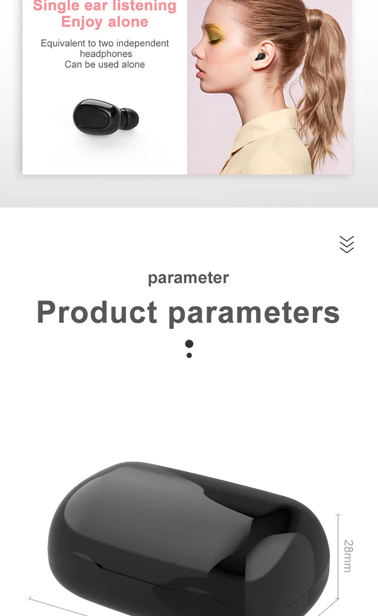 Product Information 1. Bluetooth version: V5.0 binaural call 2. Working frequency: 20-2000Hz 3. Support: battery display, music call. 4. Headphone battery capacity: 45mAh 5 charging box battery capacity: 300mAh 6.USB charging: the headset is full for 1 hour, and the charging compartment is full for 2 hours. 7. Headphone standby time: 180 hours, 8 .charging bins to charge the number of headphones: 3 times. 9. Continuous talk time: 2.5 hours - 3 hours, Music playback: 2.5 hours - 3 hours Packing List Headphones * 2pcs, Charging bin * 1PCS,USB cable *1PCS, Manual *1PCS, Ear cap * 1 pair