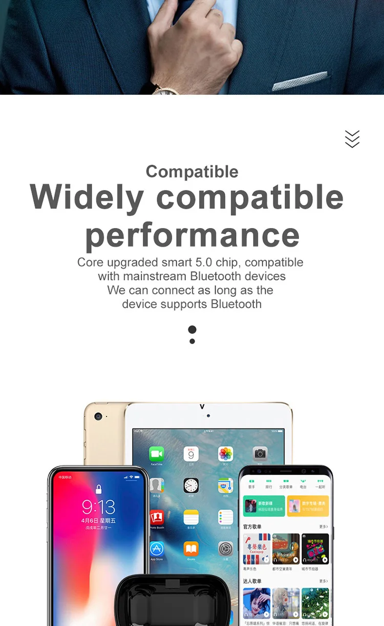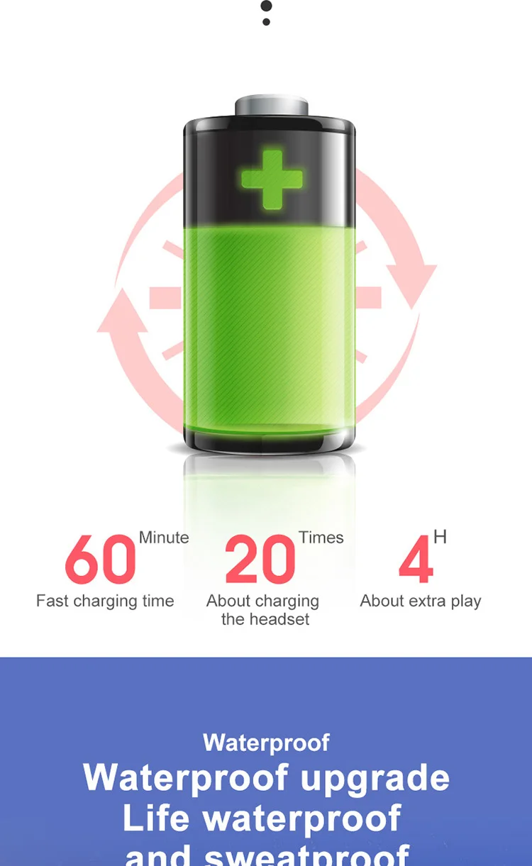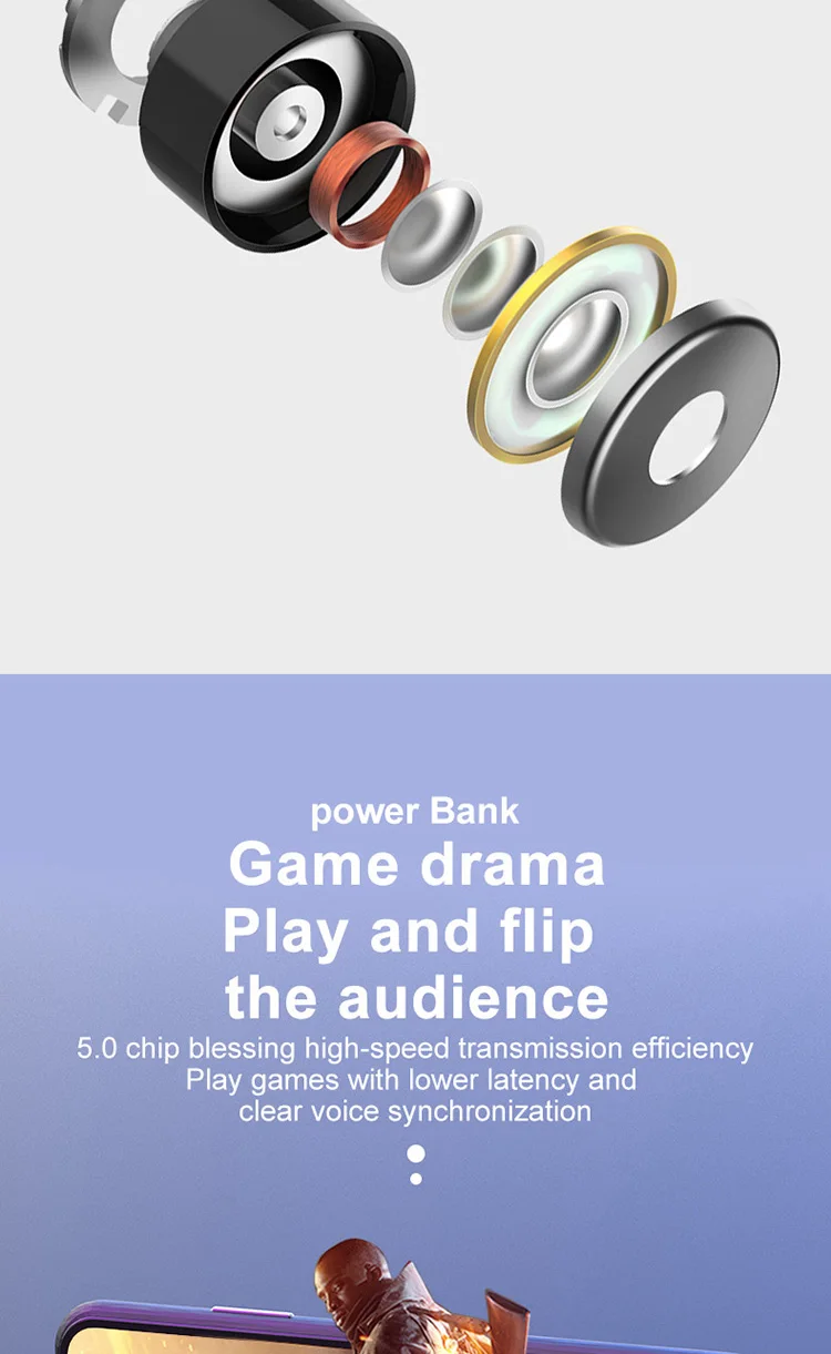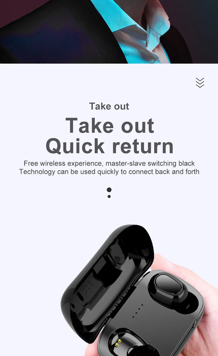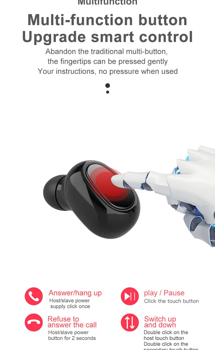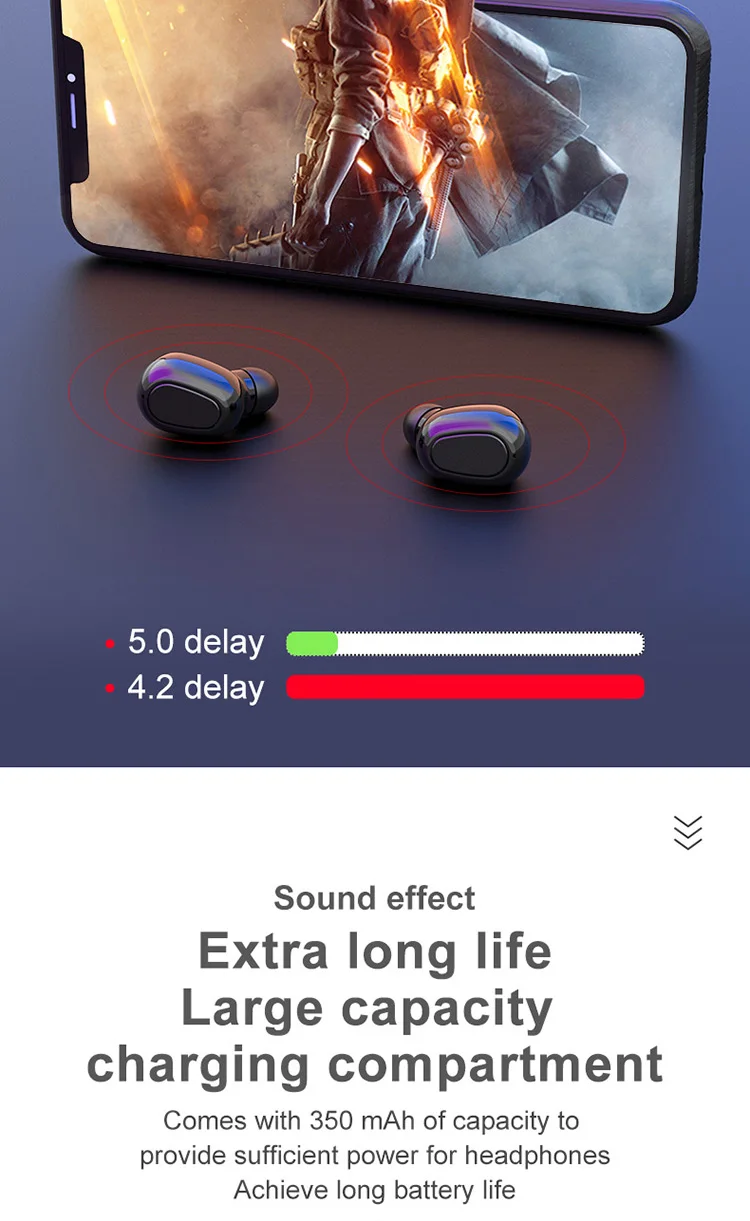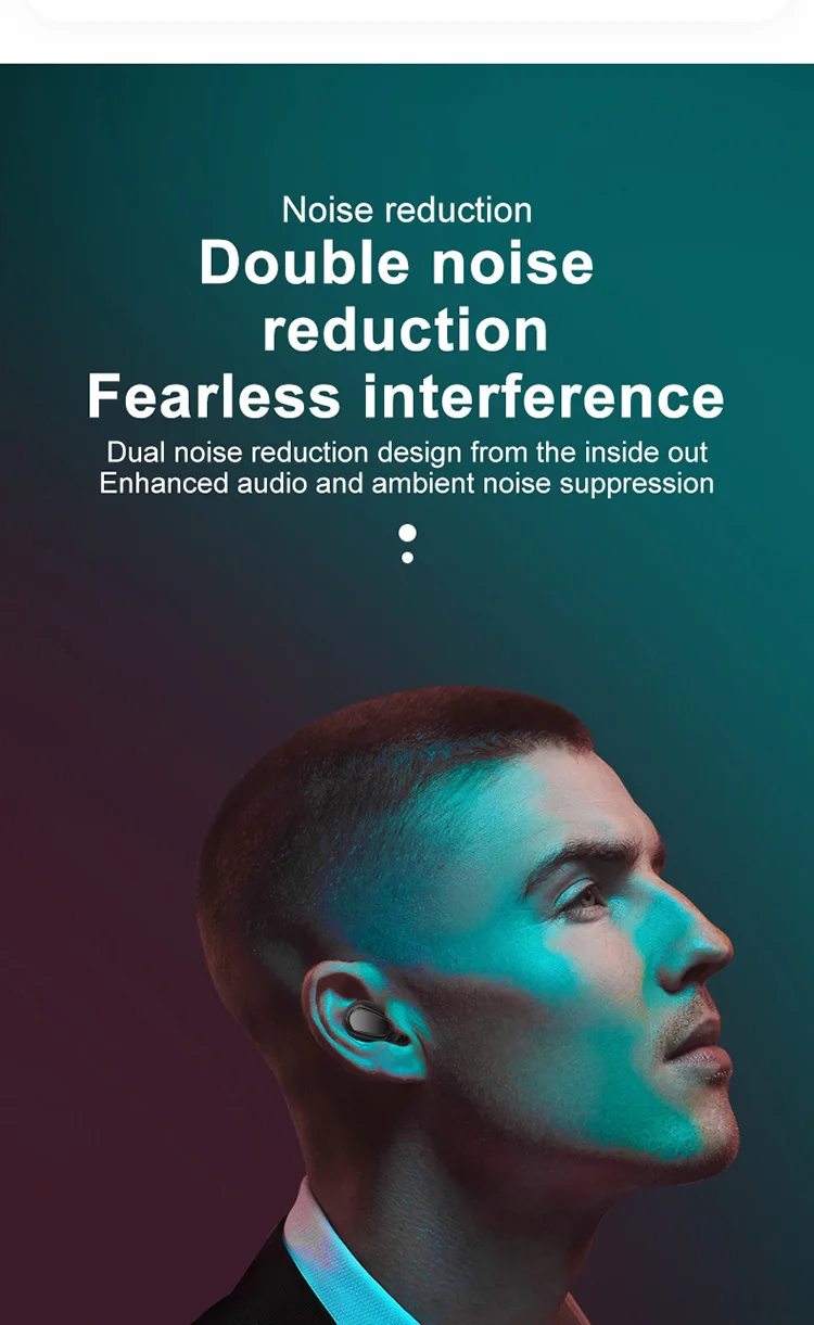Product Information 1. Bluetooth version: V5.0 binaural call 2. Working frequency: 20-2000Hz 3. Support: battery display, music call. 4. Headphone battery capacity: 45mAh 5 charging box battery capacity: 300mAh 6.USB charging: the headset is full for 1 hour, and the charging compartment is full for 2 hours. 7. Headphone standby time: 180 hours, 8 .charging bins to charge the number of headphones: 3 times. 9. Continuous talk time: 2.5 hours - 3 hours, Music playback: 2.5 hours - 3 hours Packing List Headphones * 2pcs, Charging bin * 1PCS,USB cable *1PCS, Manual *1PCS, Ear cap * 1 pair