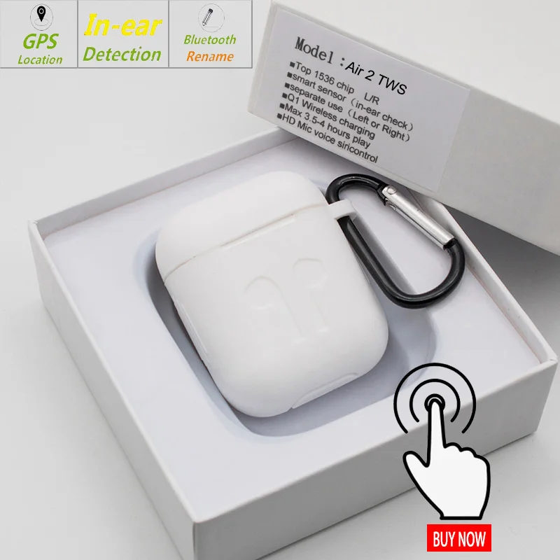 New Features: Pop up animation connect (Open the lid, no need to take out the Earbuds) Android smartphone Open the lid to search bluetooth name to pairing ! Main Specification 1.Smart in-ear sensor 2.Support Bluetooth Rename and GPS Positioning 3.Music time 3.5-4 hours 4.Separate use Left earphone and Right earphone 5.Voice assistant support Siri 6.QI Wireless Charging 7.Pop up 3 Real Battery (Loda chip 100% real,Jerry chip maybe not) 8.Left & Right Earphone + Charing Case Battery Show ! 9.HD MIC better than i12 i20 i500 i200 i8000 TWS 10.1:1 Replica size air 2 11.Tap Control like Original 12.Enhanced bass/audio quality 13.Auto power on/off 14.Binaural calls,Previous song, Next song